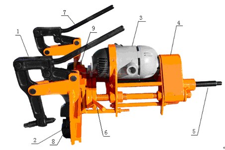 其結構:1夾具體、2定位塊、3電動機、4齒輪箱、5進給絲杠、6前板鎖緊壓把、7卡緊搬把、8擋銷、9定位銷