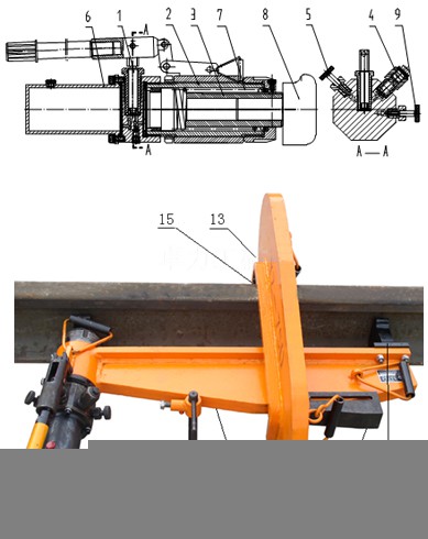 YZ—750Ⅱ型液壓直軌器是對線路上75kg/m以下各種軌型水平方向進行調直(或彎曲)的手動液壓專用工具。機體采用特種鋼鍛造而成,性能可靠。既能在鋼軌下實施直(彎)作業,以確保行車安全;也可在軌上實施作業,結構緊湊,重量輕、拆裝方便。二、主要技術參數1、最大直軌力(活塞推動力230kN) 750kN2、額定直軌力(活塞推動力189kN) 600kN 3、油壓系統工作壓力 59MPa4、工作活塞直徑×行程 Φ70×705、泵柱塞直徑×行程 Φ14×406、空載效率 1.6mm/次7、整機重量 93kg8、外廓尺寸 830×720×350 三、基本結構與工作原理1、基本結構:該機結構型式為分體式。由動力部分和組合機體兩大部分組成。動力部分:由1柱塞泵、2油缸、3活塞桿、4溢流閥、5卸荷閥、6油箱、7復位彈簧、8油缸頂頭、9安全回油閥組成。組合機體:由10直梁、11活動頂頭、12直梁支桿、13鎖緊鉤梁、14調整斜鐵、15鉤梁頂頭等組成。